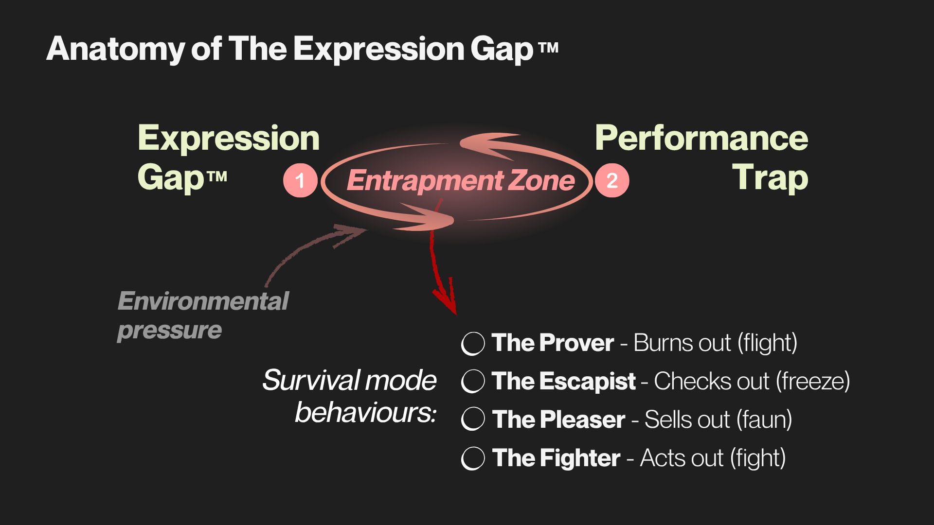 Many of us are all too aware of the illusion that external achievement doesn’t equal fulfilment. The Performance Trap is when your self-worth depends on your next win, and it fuels the Expression Gap. Every presentation, every project, every promotion becomes proof you’re still ‘enough’. Until it doesn’t.